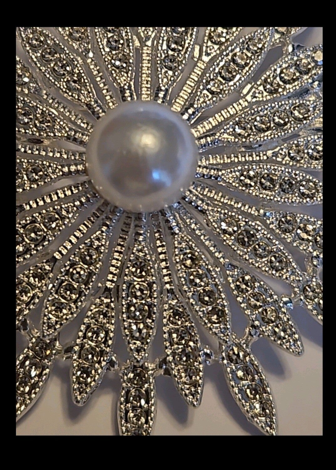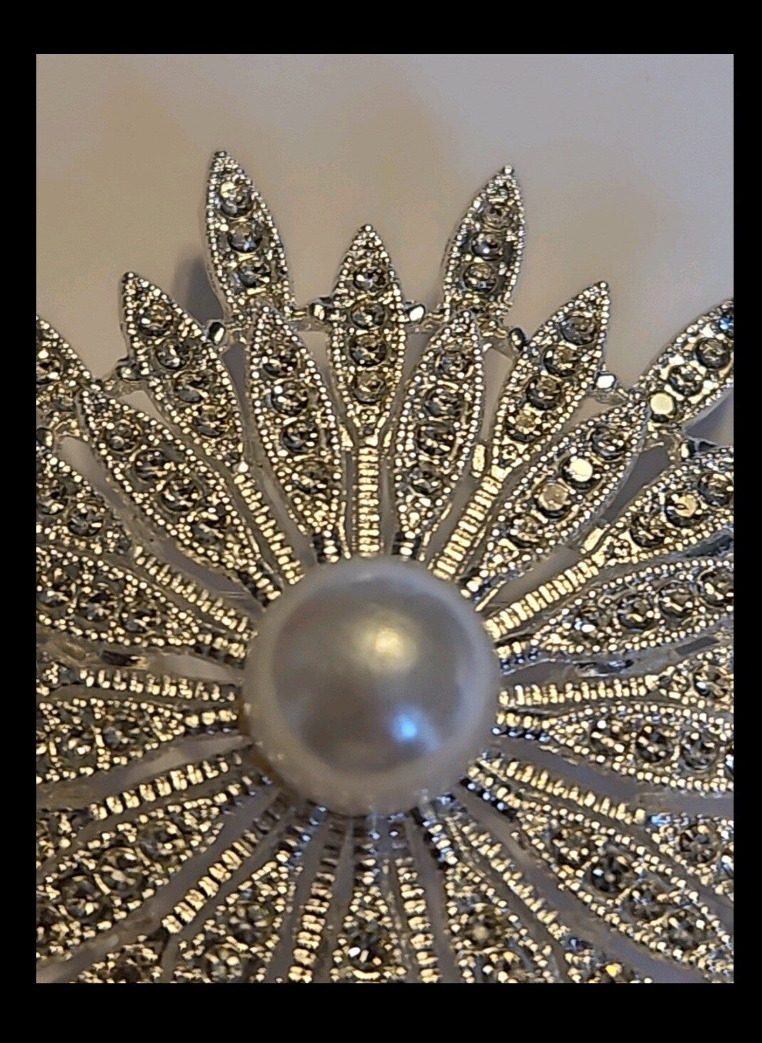 Sunburst Brooch with Faux Pearl and Rhinestone Silver Tone